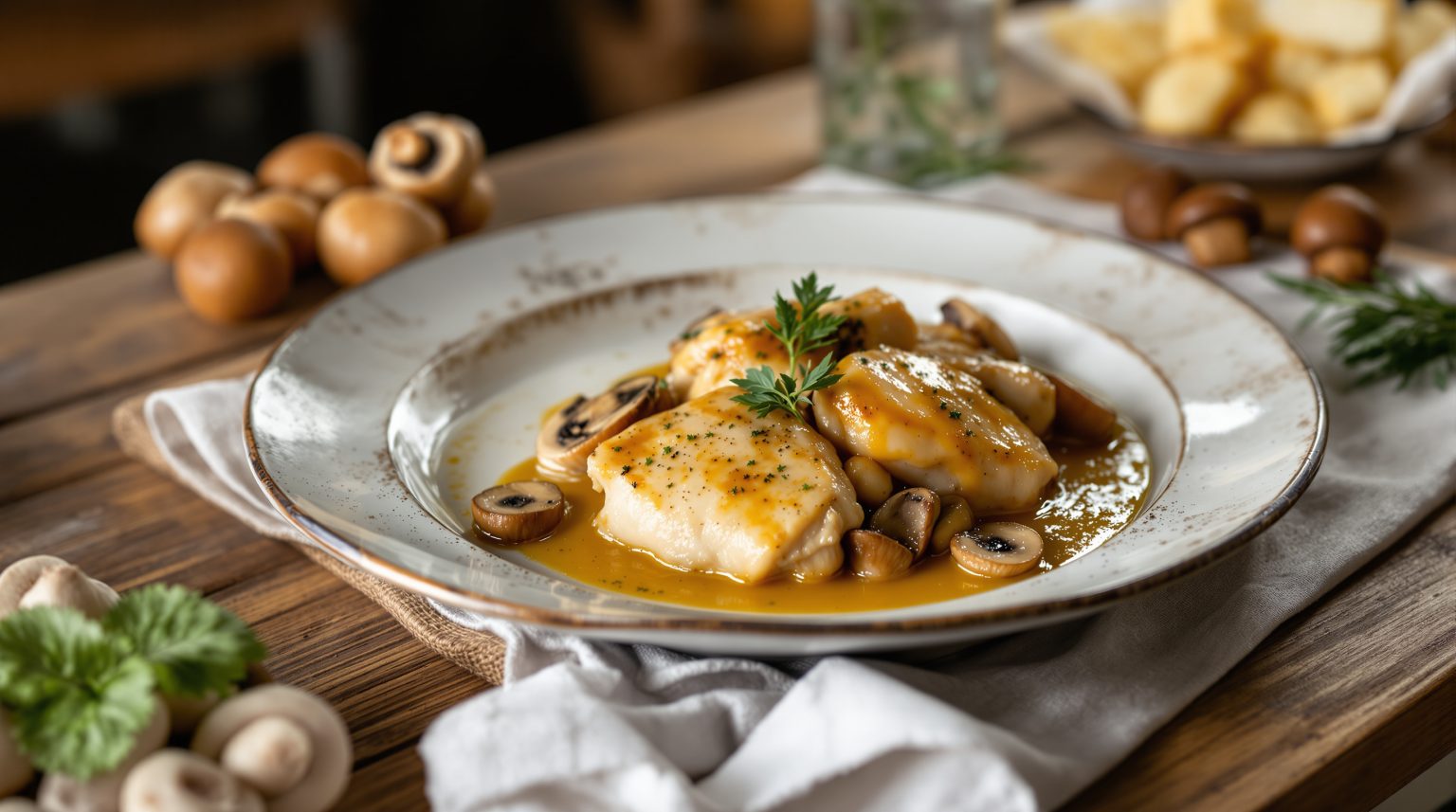 Pour le poulet au vin jaune Robuchon, le vin jaune du Jura reste l’ingrédient emblématique, apportant ses arômes de noix, de curry et sa finesse unique. Néanmoins, des alternatives peuvent sublimer la sauce tout en respectant l’esprit du plat. Le Chardonnay du Jura, avec sa minéralité élégante, offre une belle complémentarité, tandis que le Sauvignon Blanc apporte une touche de fraîcheur et d’agrumes, idéal pour alléger la sauce. Le Pinot Gris peut également être choisi pour sa rondeur fruitée qui équilibre la richesse de la crème. La sauce, toujours onctueuse, mêle bouillon de volaille, crème fraîche et une liaison à base de Maïzena ou beurre manié, pour conserver la texture soyeuse chère à Robuchon.